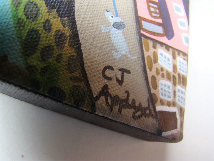 Naive acrylic on canvas of a fishing port.