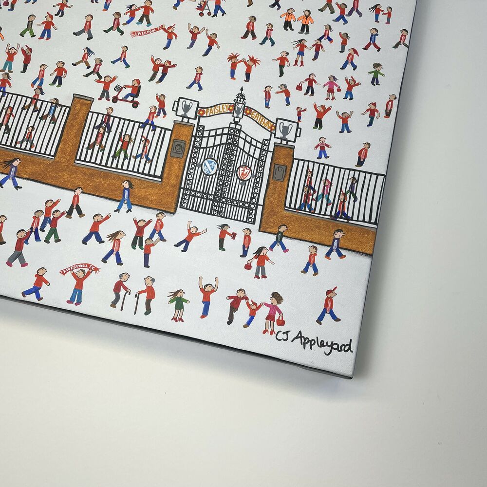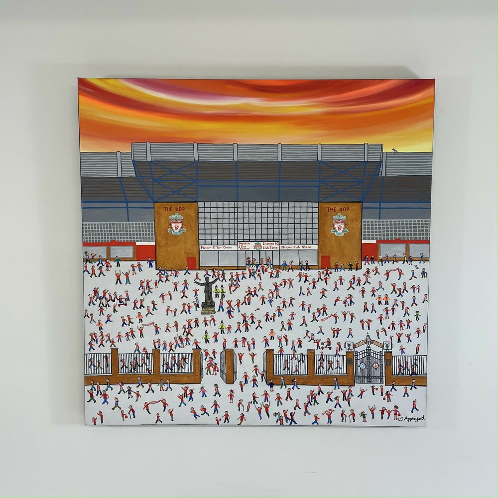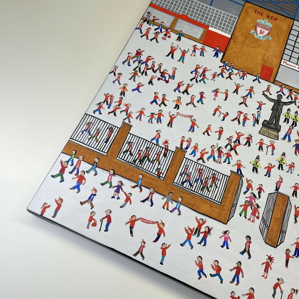 Naive Acrylic on Canvas of fans outside of Anfield, Liverpool Football Club's stadium.