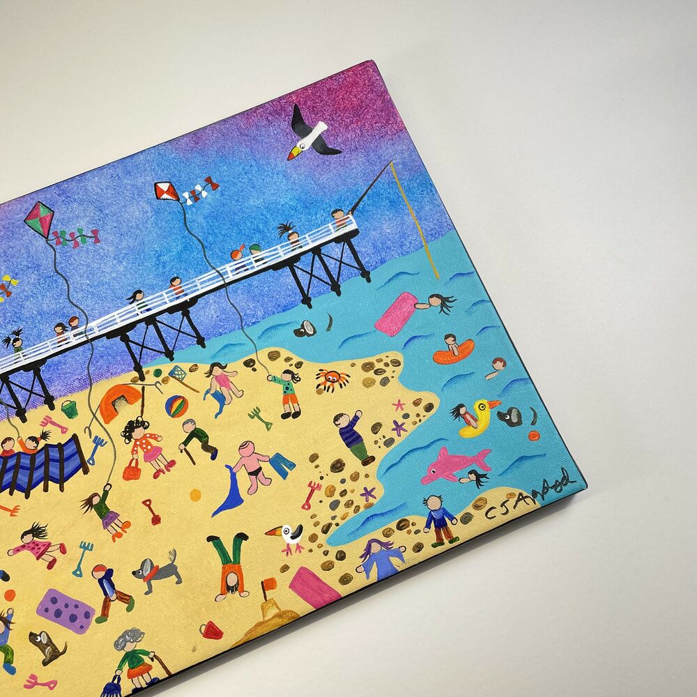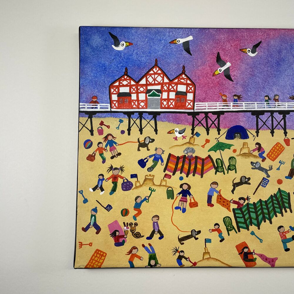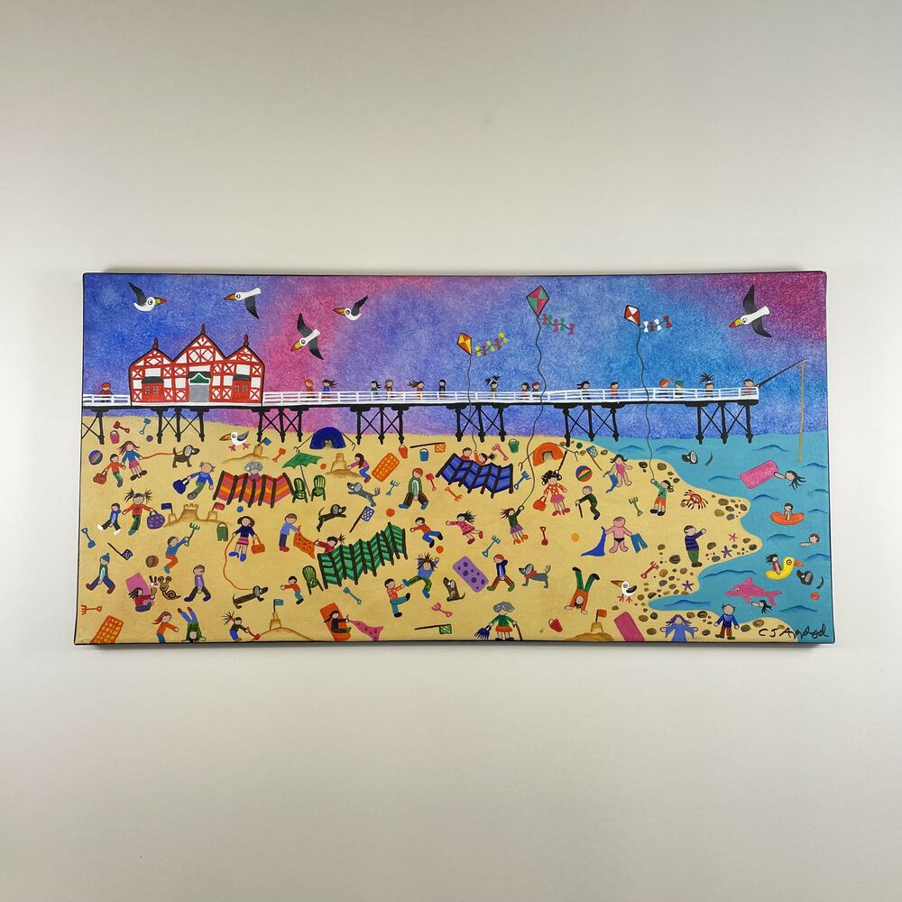Naive acrylic on canvas of Saltburn Pier in North Yorkshire.