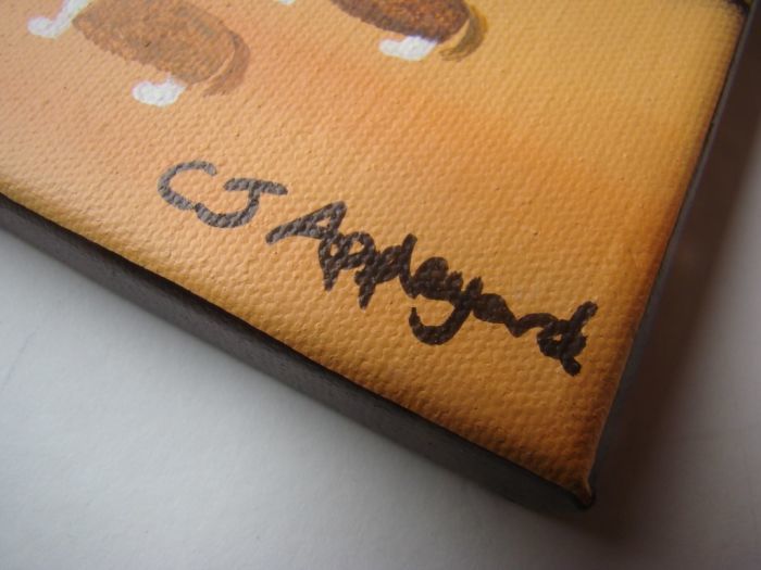 Naive acrylic on canvas of Queen Elizabeth II having a cup of tea surrounded by corgis.