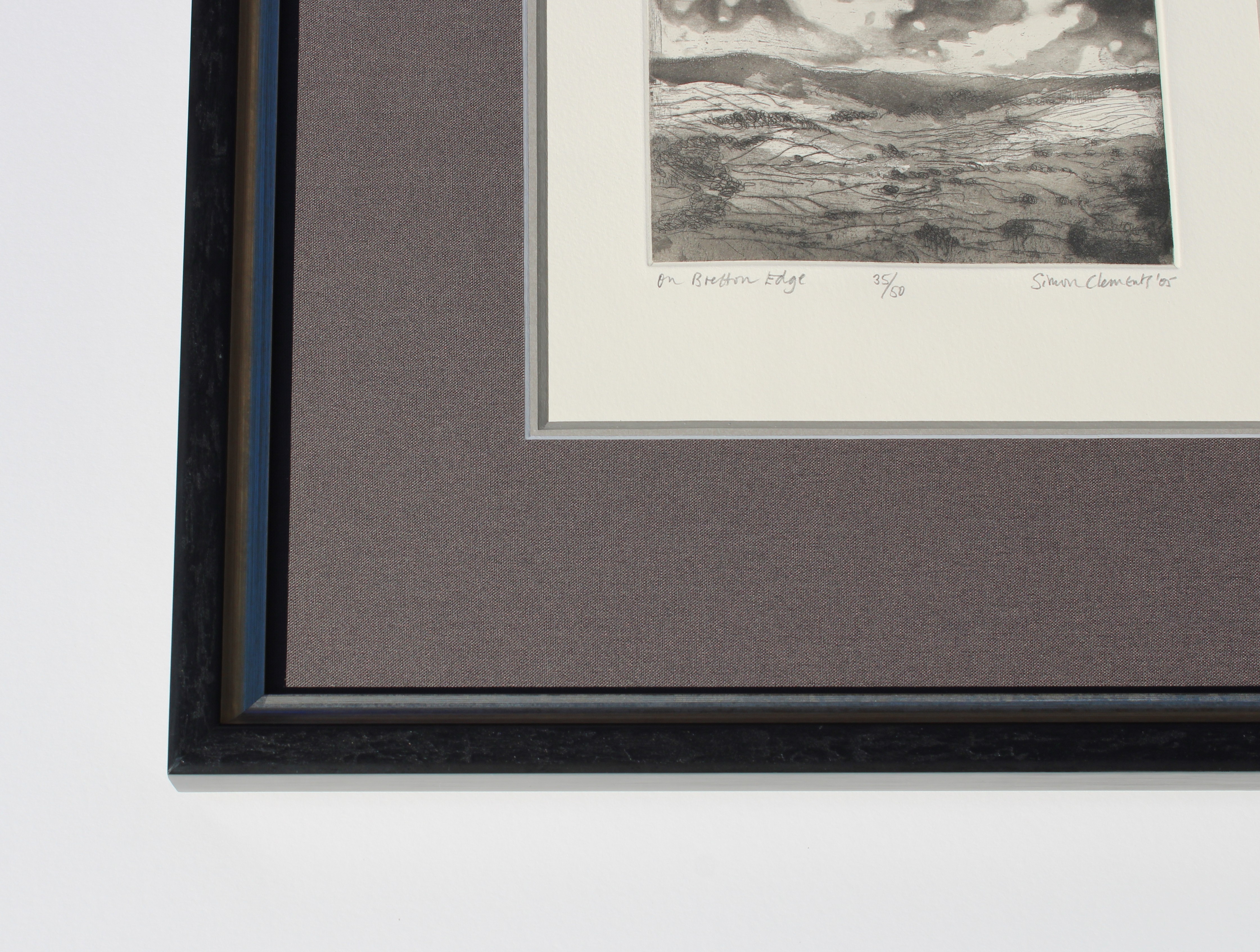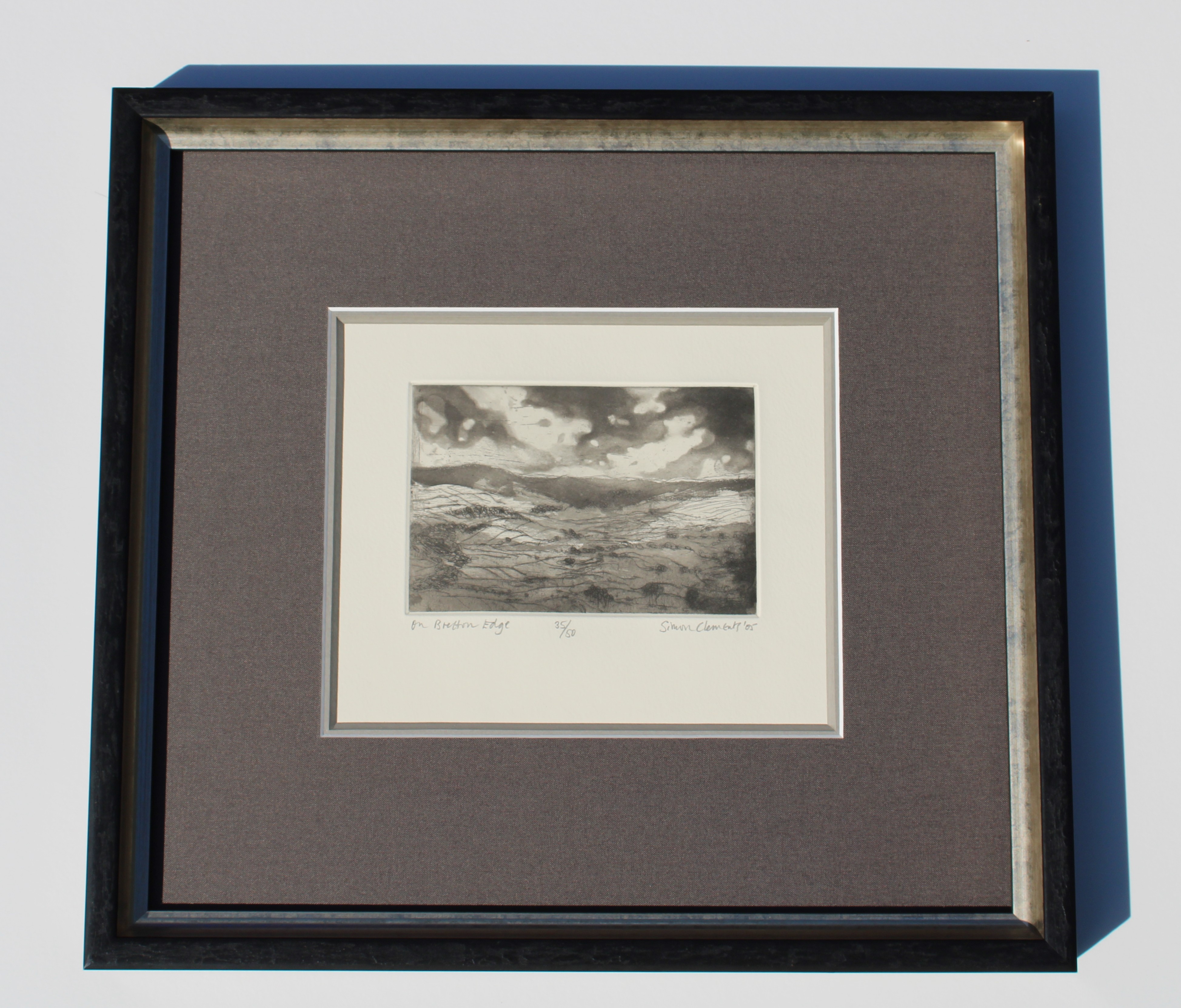 An atmospheric achromatic landscape double mounted with a grey linen top mount and a high quality Italian picture frame moulding painted black with an inner edge finished in silver foil.