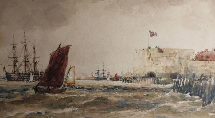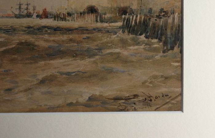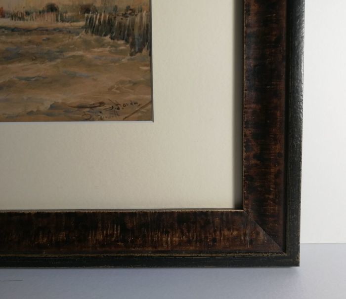 This an original watercolour signed by Thomas Bush Hardy, it has been professionally framed by our team of in-house Fine Art Trade Guild commended framers. The subject of the watercolour is a port with Union Jack flag blowing in the wind. This watercolour painting has a 70mm wide museum mount surrounding the watercolour. The moulding used to frame this painting is 399405, a real solid wood dark brown moulding (38mm wide).