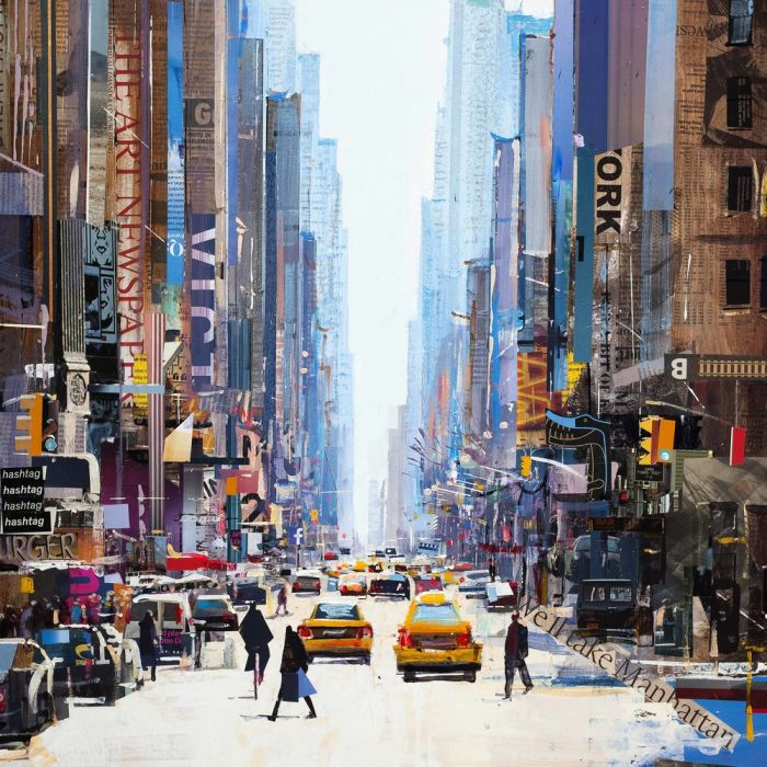 Taking Manhattan by Tom Butler, bustling Manhattan is often described as the cultural, financial, media, and entertainment capital of the world. The overwhelming towering buildings draw you into The City, in this superb collage style of Tom Butler.