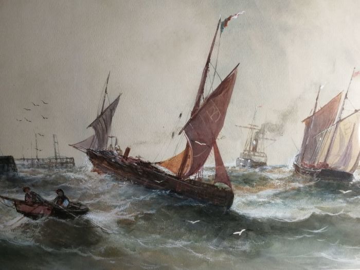 Please note while it is signed TB Hardy, we are selling this picture as after TB Hardy, meaning it may have been painted by another. This a well painted original watercolour. The subject of the watercolour is a pier where a small rowing boat with 2 passengers is on rough seas amidst other larger sailing ships. It has been professionally framed by our team of in-house Fine Art Trade Guild commended framers.