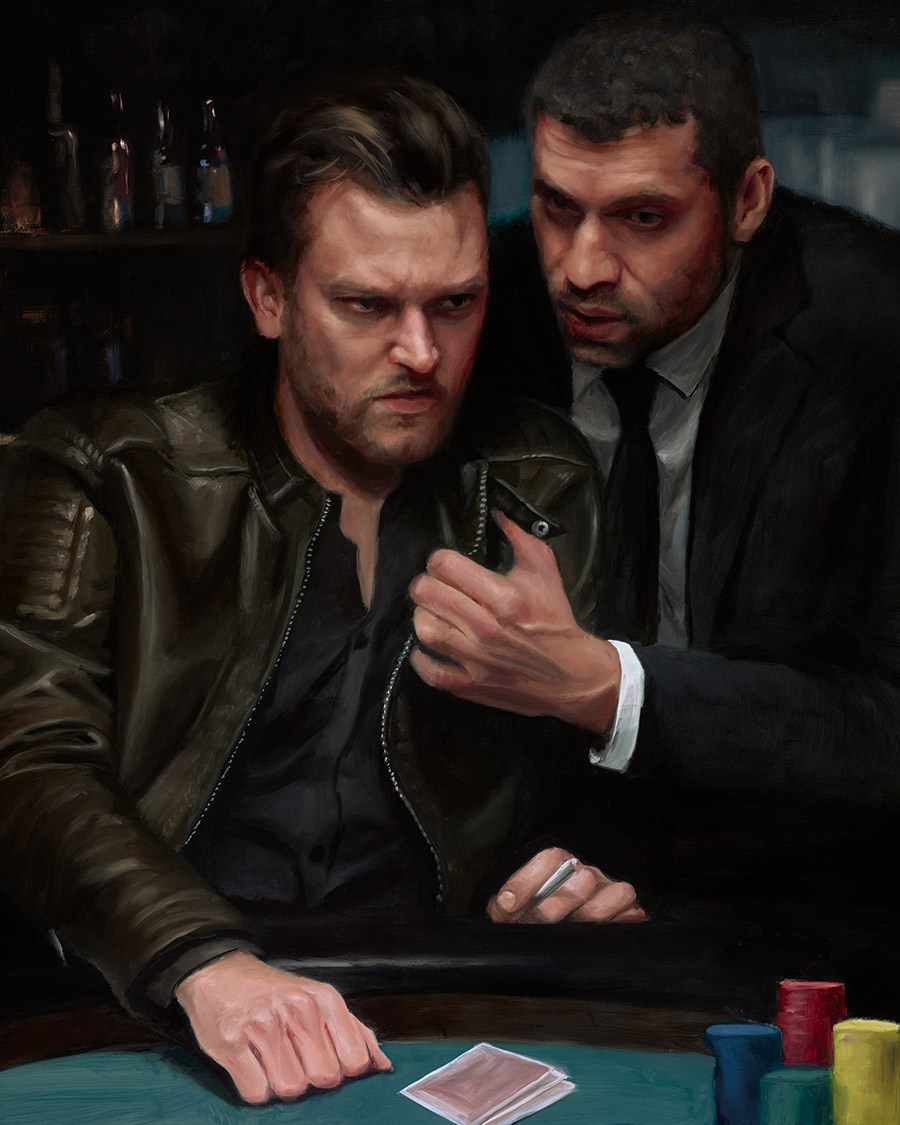 Reminiscent of movie greats and gritty scenes from years gone by, Vincent creates a dark and tense atmosphere in this superb painting at the poker table. 61/150