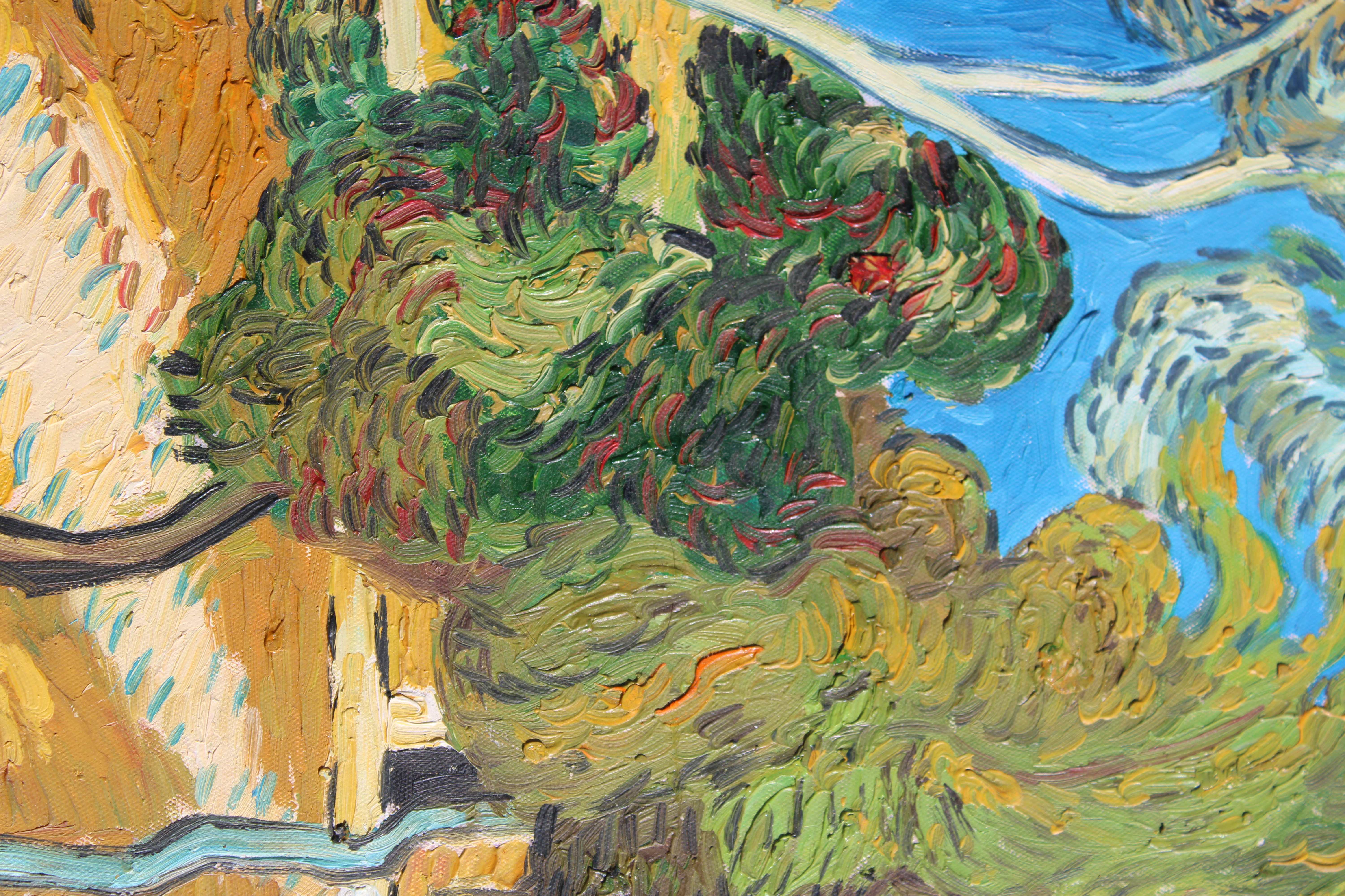 'Trees in the Asylum' after Van Gogh. Generous textured oil painting on canvas board.