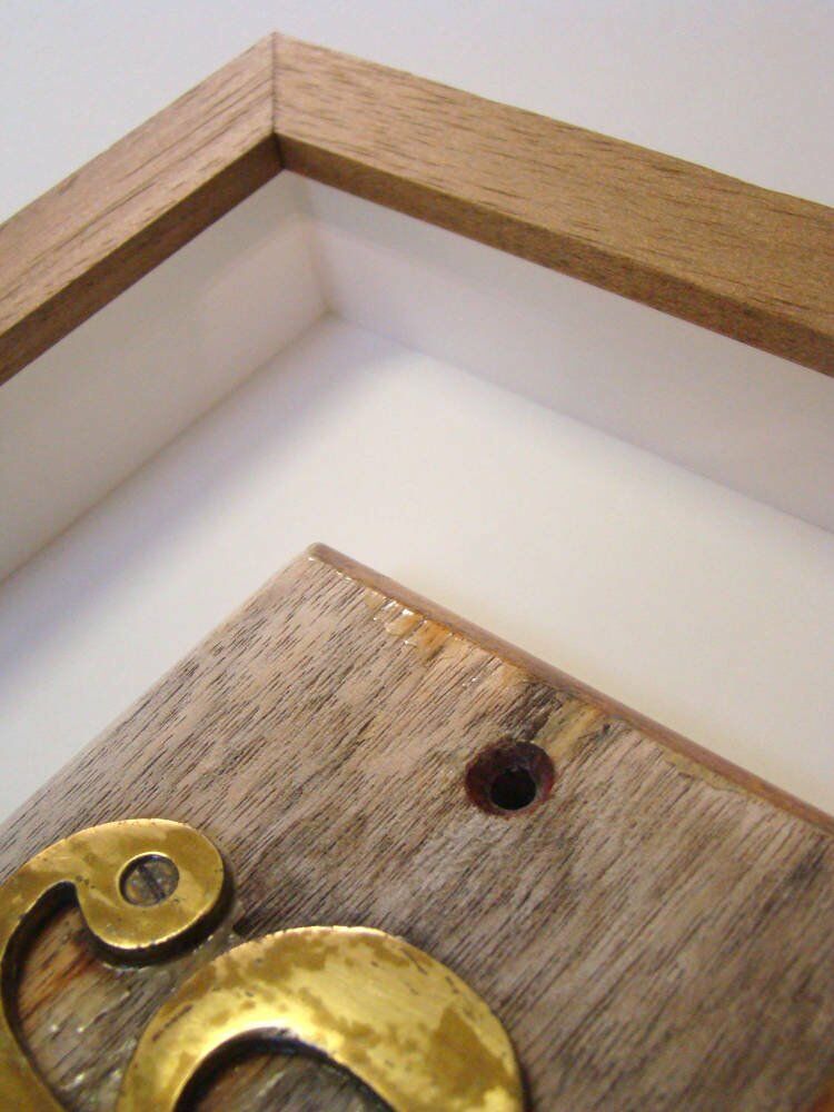 We chose a barefaced wood moulding which was deep enough to hold the key and block of wood, and made bespoke spacers in the same colour as the snow white undermount for the inner edges of the frame to stop the glass touching the items.