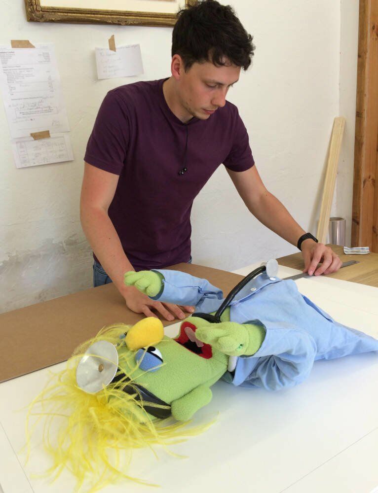 As proud members of the Fine Art Trade Guild (FATG) everything we frame is in line with their standards; one of which is to ensure that all framing is reversible. We therefore hand stitched the puppet in place which to allow our customer to remove it, undamaged, from the frame at any point in the future, should he ever wish to.