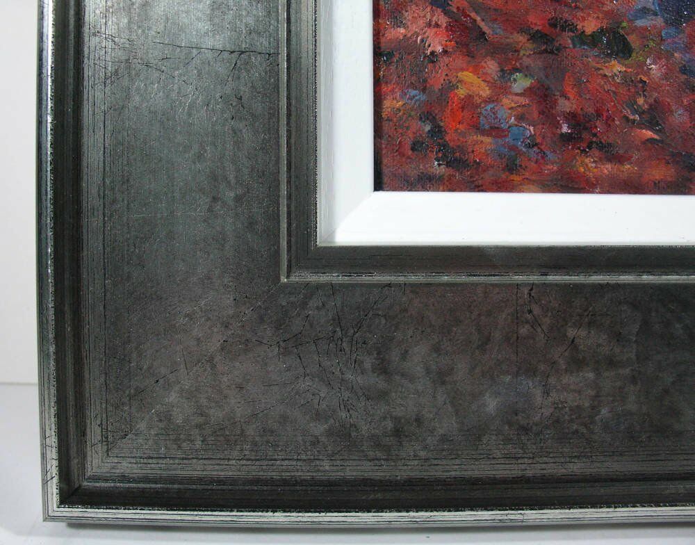 We chose a silver painted pine moulding which matched the bark of the trees very well - 612348000 - but it needed something in between it and the artwork to create definition. With a watercolour (which would require glass) a mount would serve this purpose but for an oil or acrylic (which don't tend to be glazed) another moulding is used. In this instance we used a narrow 'slip moulding' in white which creates a stark contrast to the colours either side, and produces a neat, sharp edge to the canvas.
