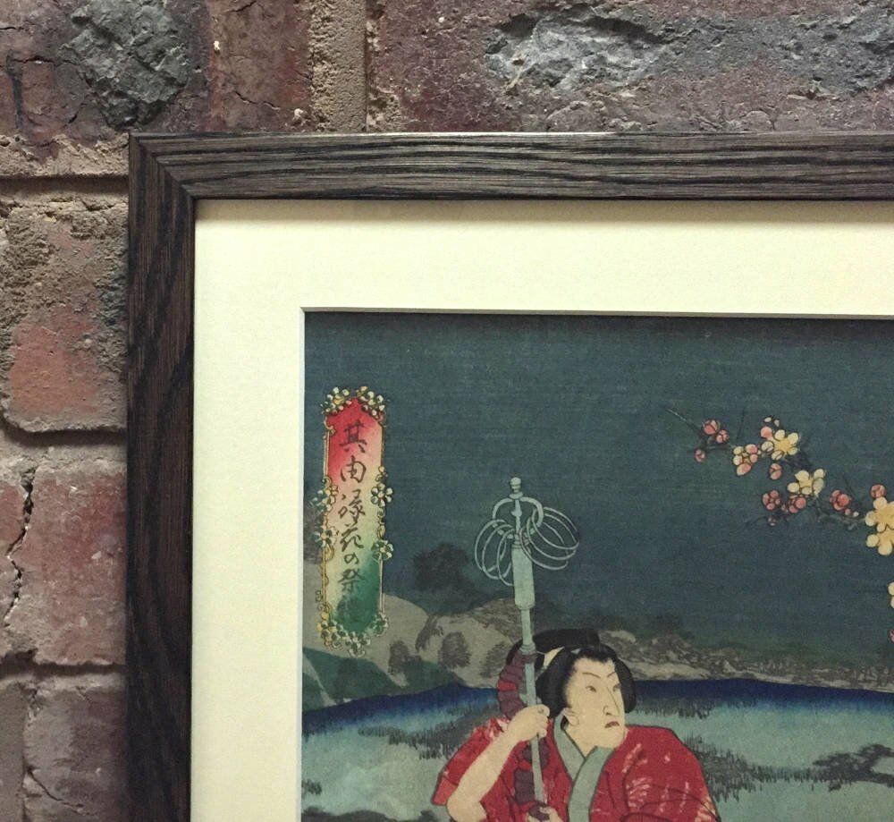 For the frame, we chose a moulding with a simple profile, and added a dark stain by hand to match the colours in the artwork.