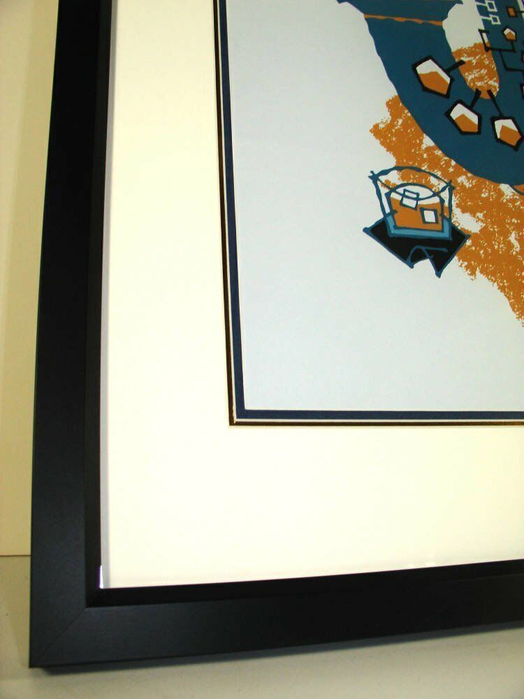 We then triple mounted the print to reveal narrow lines of blue (with a black core) and gold (with a white core) underneath the top pale cream mount, which echo the strokes made to create the artwork.