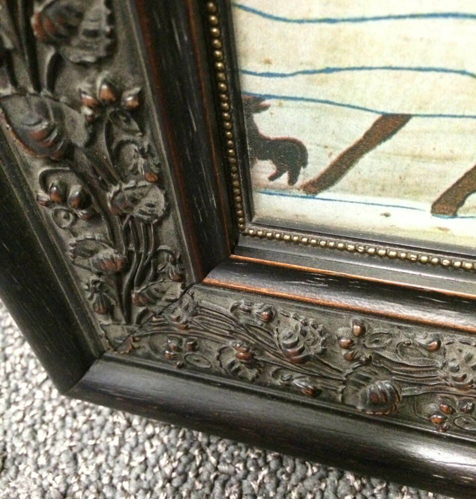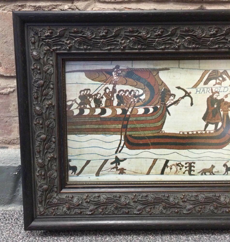 This print of a scene from the Bayeux Tapestry - entitled Harold hic Apprehendi (Here Harold was seized) - was brought to us for framing in 2016. The scene depicts the moment during the Battle of Hastings when Harold, the Earl of Wessex, is captured by Duke William of Normandy after being shipwrecked.