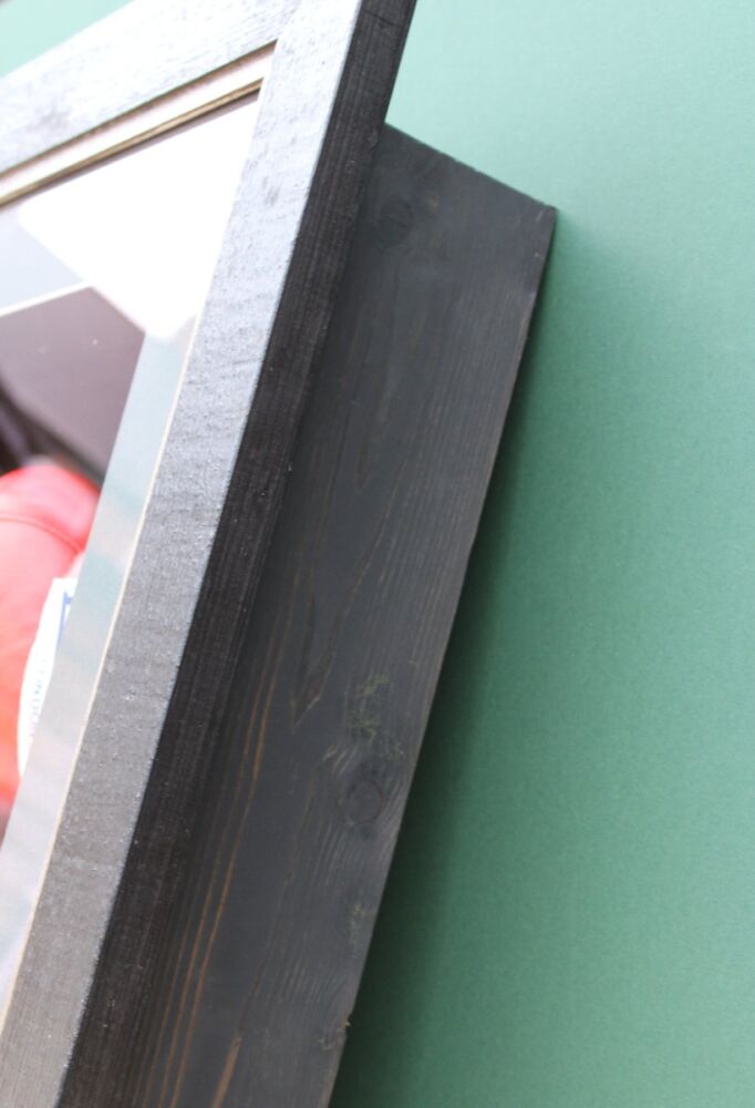 We created a frame for the glove by extending the rebate of a black picture moulding (with a silver inner edge) using panels of timber large enough to accommodate its depth, and then staining the panels to match the moulding.