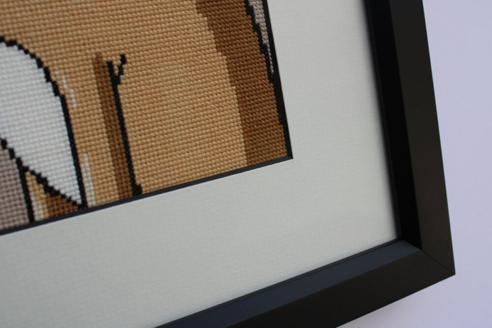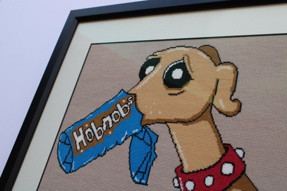 Our customer – a huge Pete and Frank fan – obtained permission from the Pete McKee Gallery in Sheffield to painstakingly create her own cross stitch pattern (for personal use) depicting one of his most popular images, 'Dog Biscuits', in order to embroider this gem.