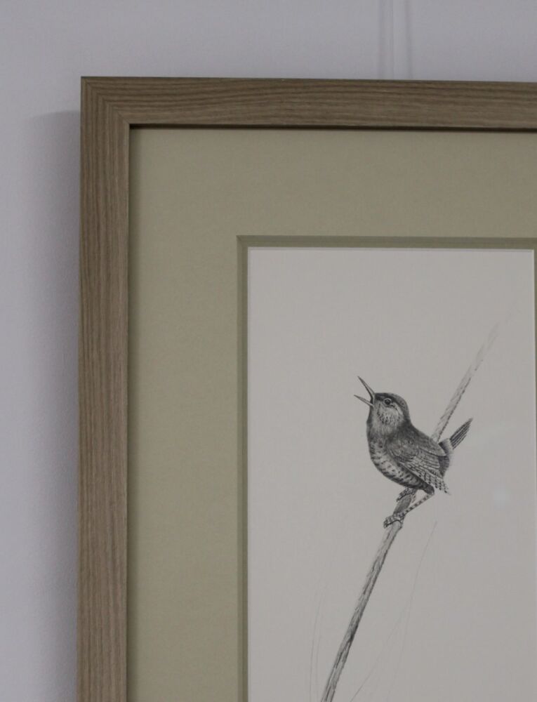 This delicate pencil drawing of a wren on a reed, by British artist and sculptor, Ian Greensitt, was brought to us for framing in 2024.