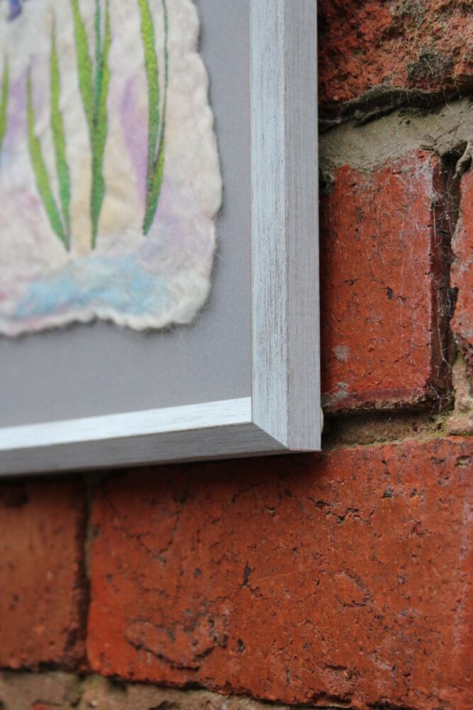 The lavender-grey mountboard the artwork is floated on really brings out the different shades of indigo, and is then balanced out by a brushed white moulding with a subtle silver line from our Colorato collection.