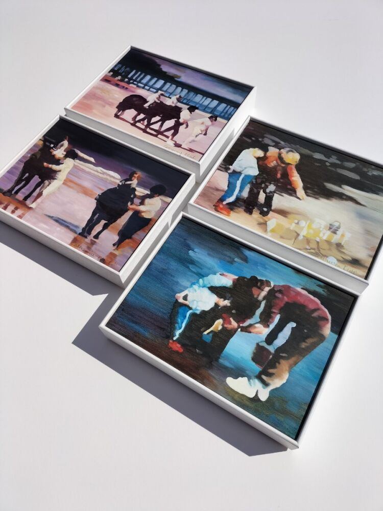 As the pictures are painted on board, we decided to display them in white stained inset frames for that 'float frame' look.