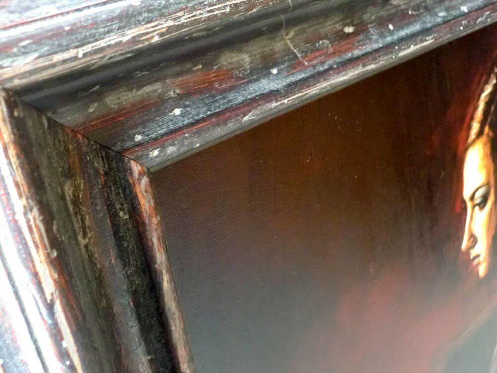 Printed on canvas, the rich and dramatic atmosphere of the picture, entitled 'Medias Negras V', is reflected in our choice of moulding - 600542 - a dark tactile scooped profile moulding from our Sevilla collection.