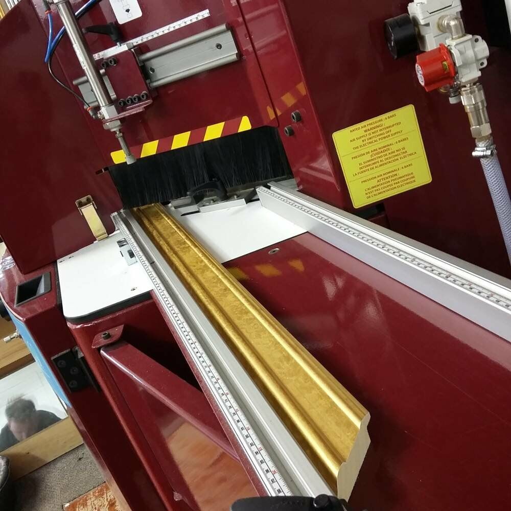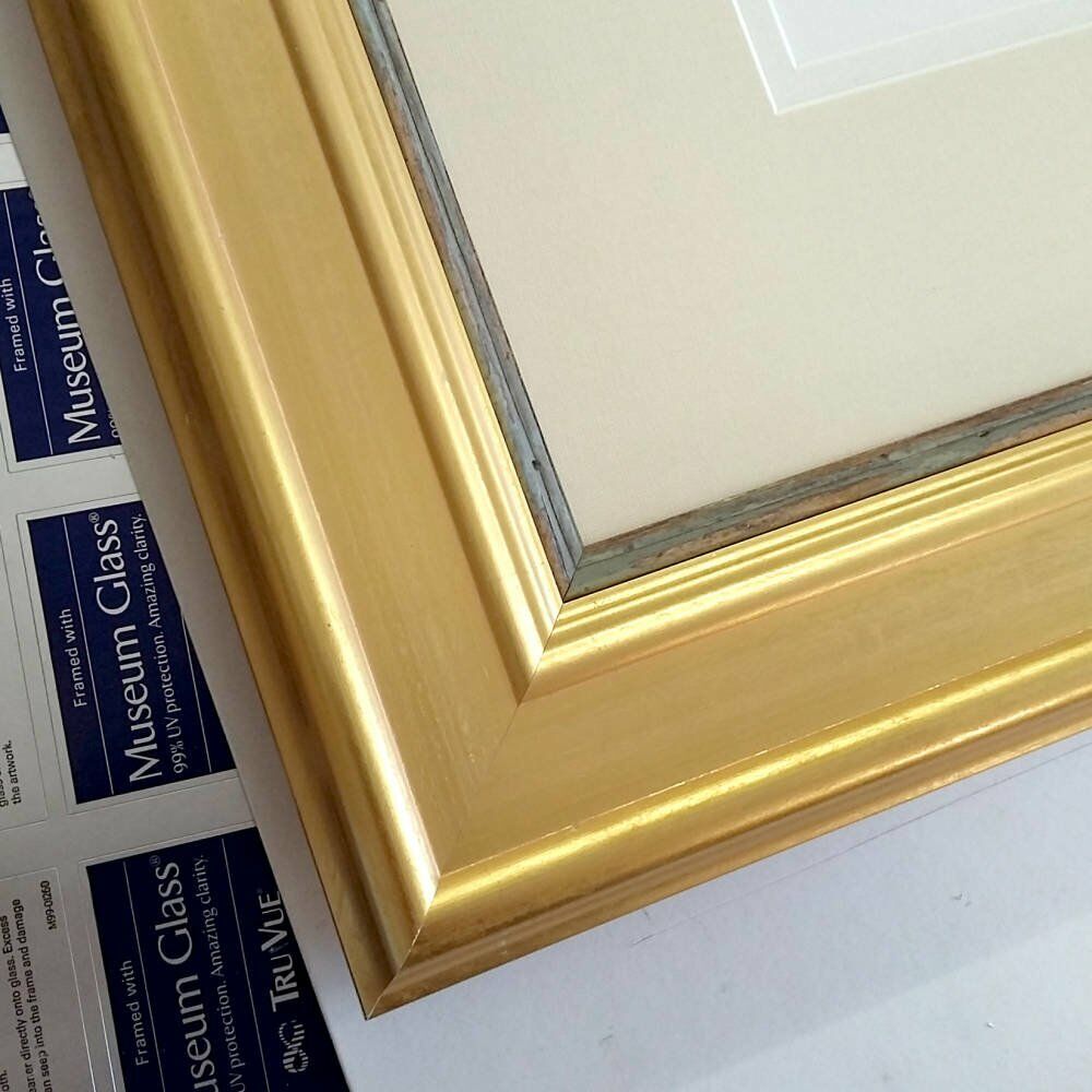 We chose a combination of gold painted picture frame moulding along with a narrow pale green slip moulding, both of which complement the colours used in the artwork.