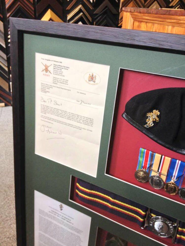 We always ensure we spend as much time as the customer needs looking at different mounting, framing and glazing options. In this instance we decided on a dark green multi aperture window mount over a dark red undermount, with each item carefully positioned to ensure an overall sense of balance.