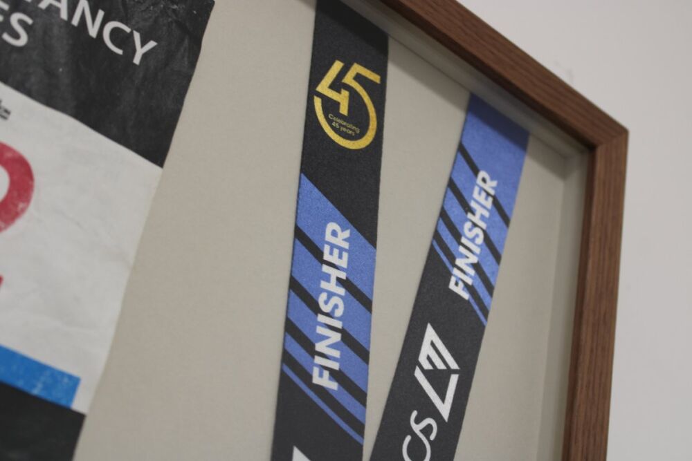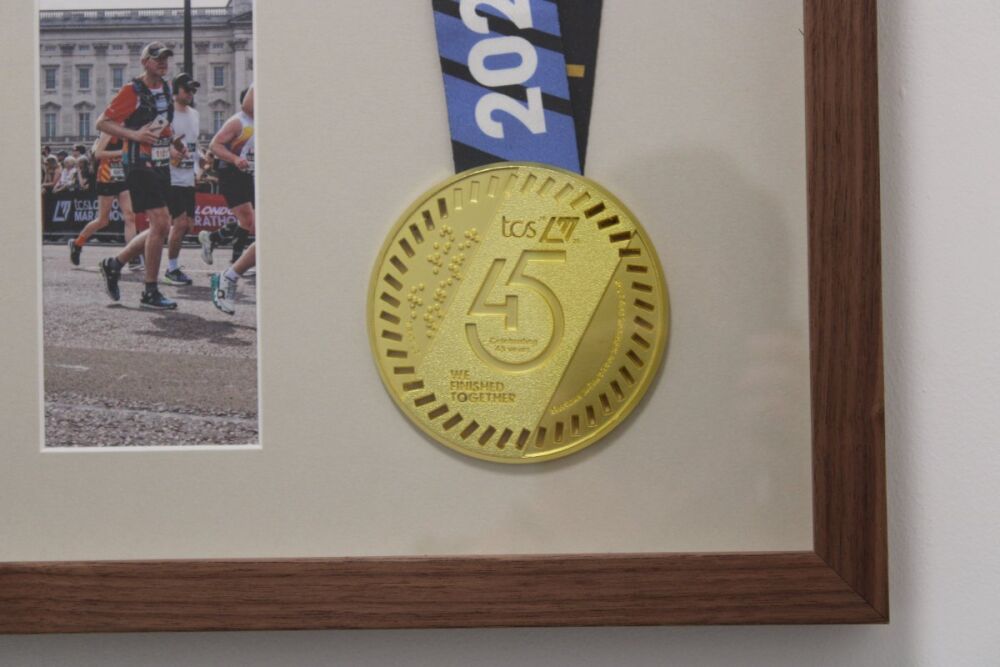 One of our customers – an avid runner – completed the 45th London Marathon in April 2025 to raise money for Alzheimer’s Research UK, and brought his medal and race bib – along with a few photos – to us for framing later in the year.