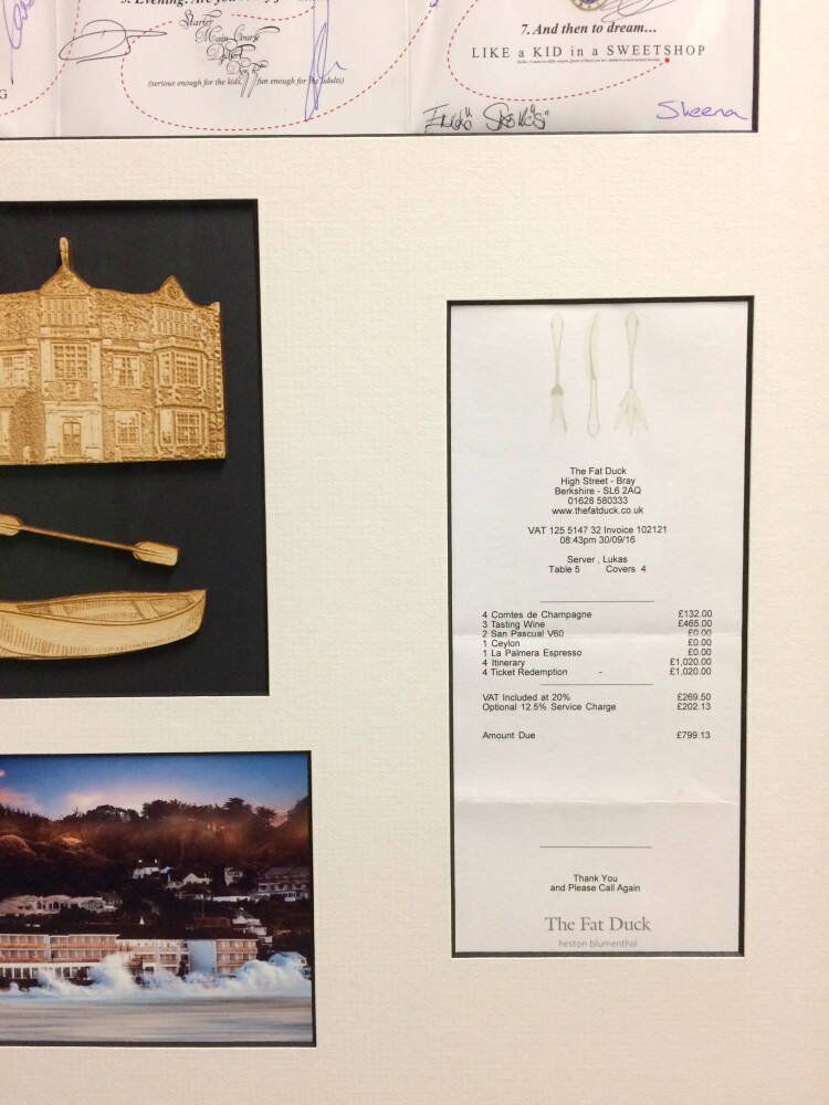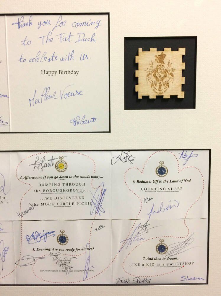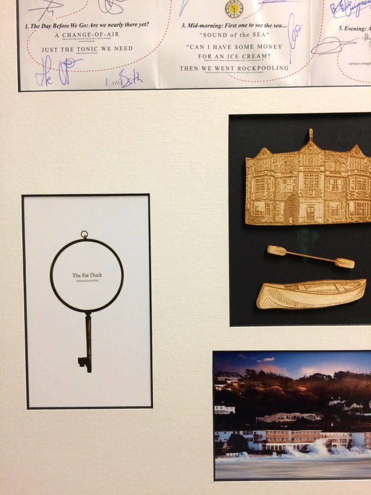 This collection of memorabilia was brought into us for framing by a customer who had recently celebrated his birthday at The Fat Duck and whose friends had all signed the menu for him.