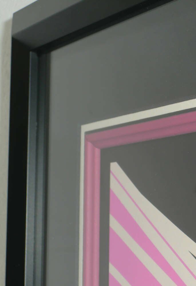 Our customer wanted something eye catching and "a bit different to the norm" so although we used a contemporary black moulding, we added two blackcore mounts and a bright pink mount slip which brilliantly echo the colours in the artwork, and make this display a real "head turner"!