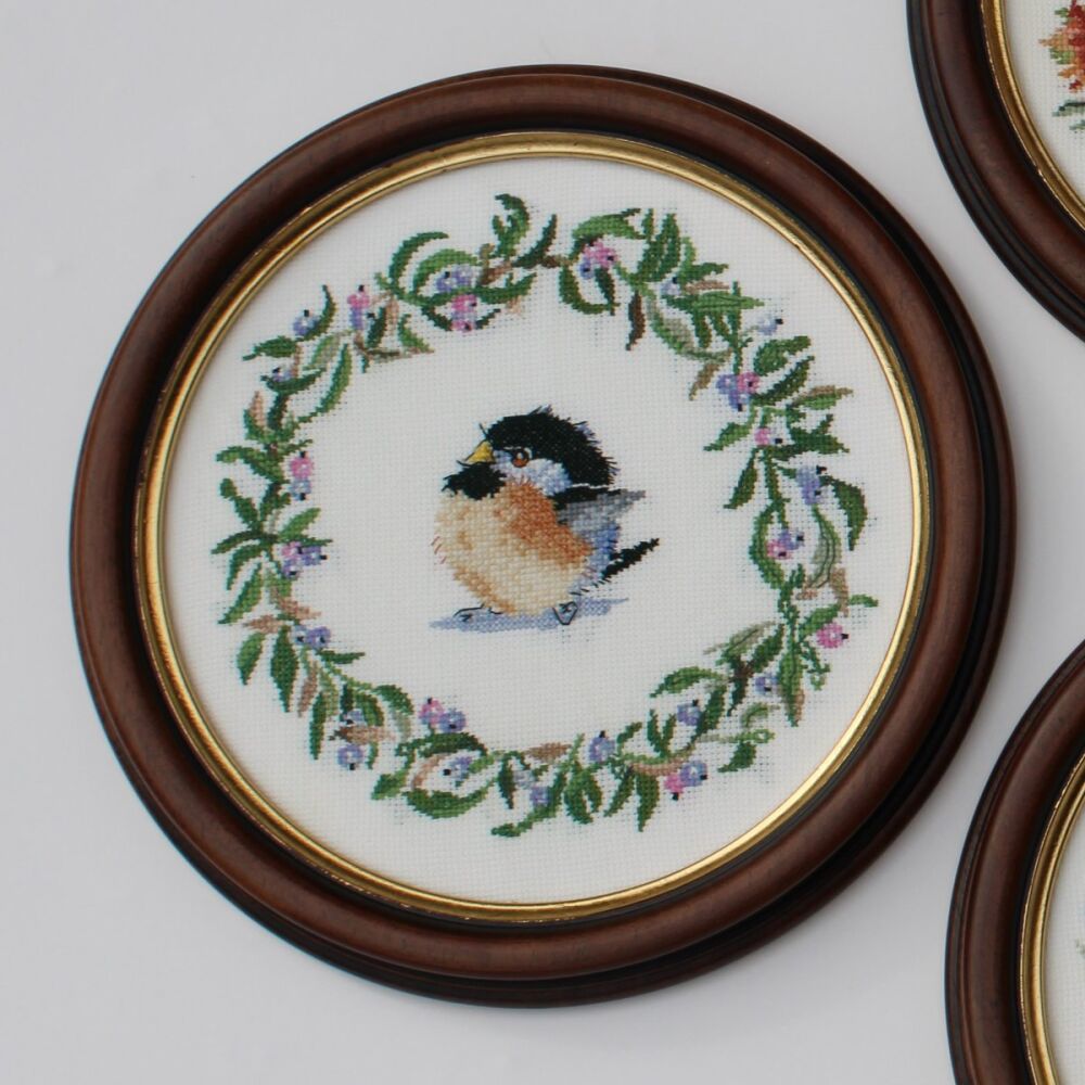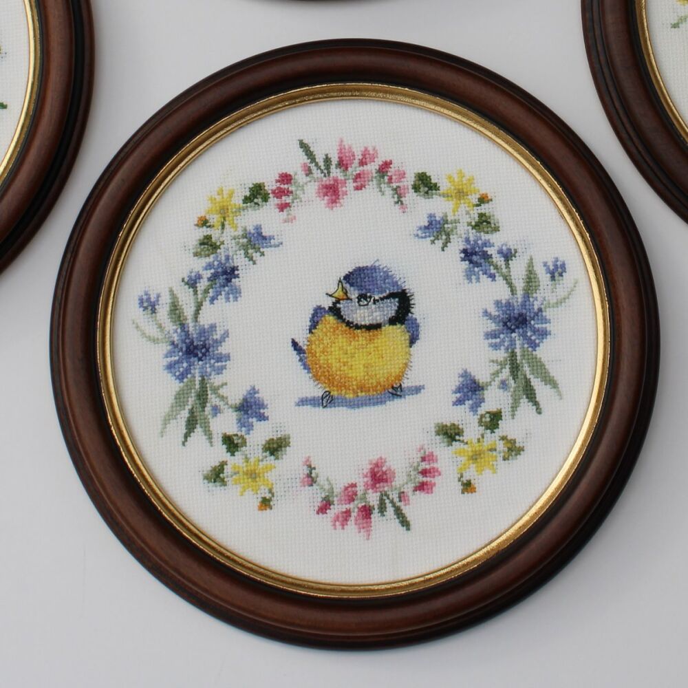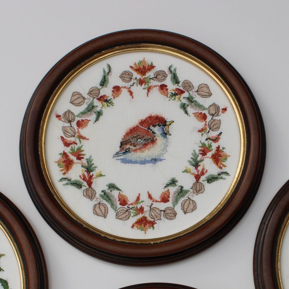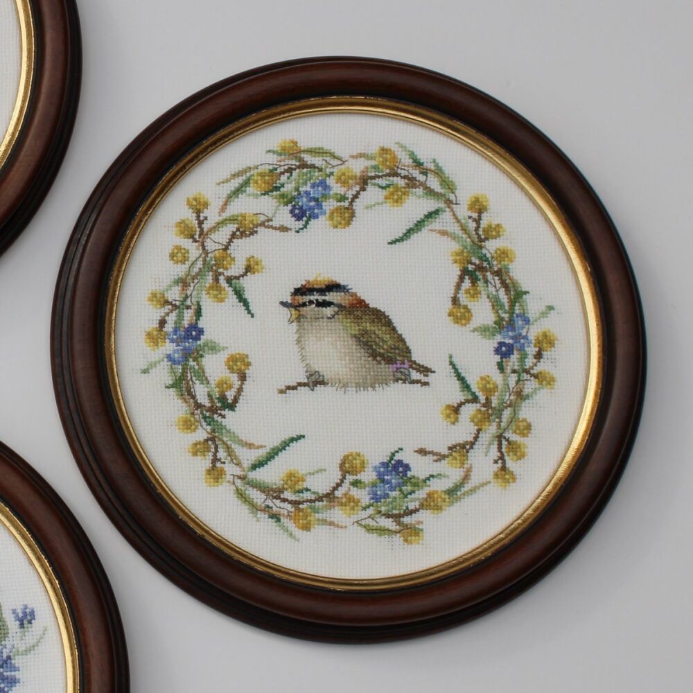 Our round frames are a great choice for displaying more traditional artwork, such as these delicately embroidered circular cross stitches brought to us in 2023 to stretch, lace and frame.