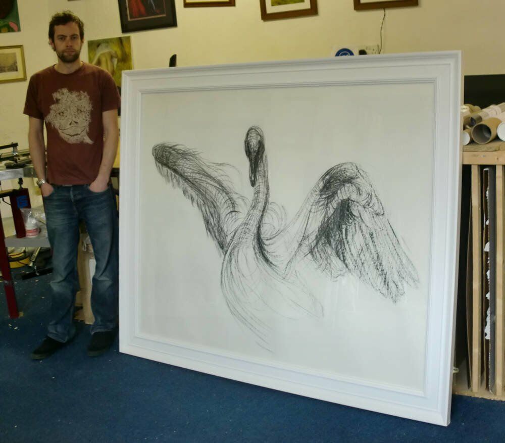 This impressive monochromatic drawing of a swan needed a large strong frame which didn't distract the eye from the artwork.