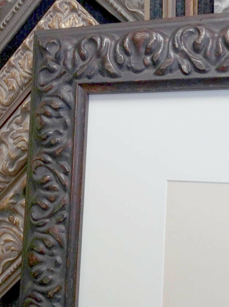 We used an ornate, dark brown moulding with a reverse profile together with a classic off-white mount to create an antique-looking display in keeping with the time period.